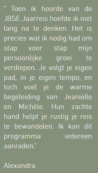” Wat ik zo fijn vind aan de JBSE Jaarreis is de flexibiliteit. Je bepaalt zelf hoeveel tijd je eraan besteedt. Zelfs als je even een pauze neemt, kun je daarna makkelijk verder. Zo past het altijd bij jouw ritme en voelt het nooit als een extra taak. “